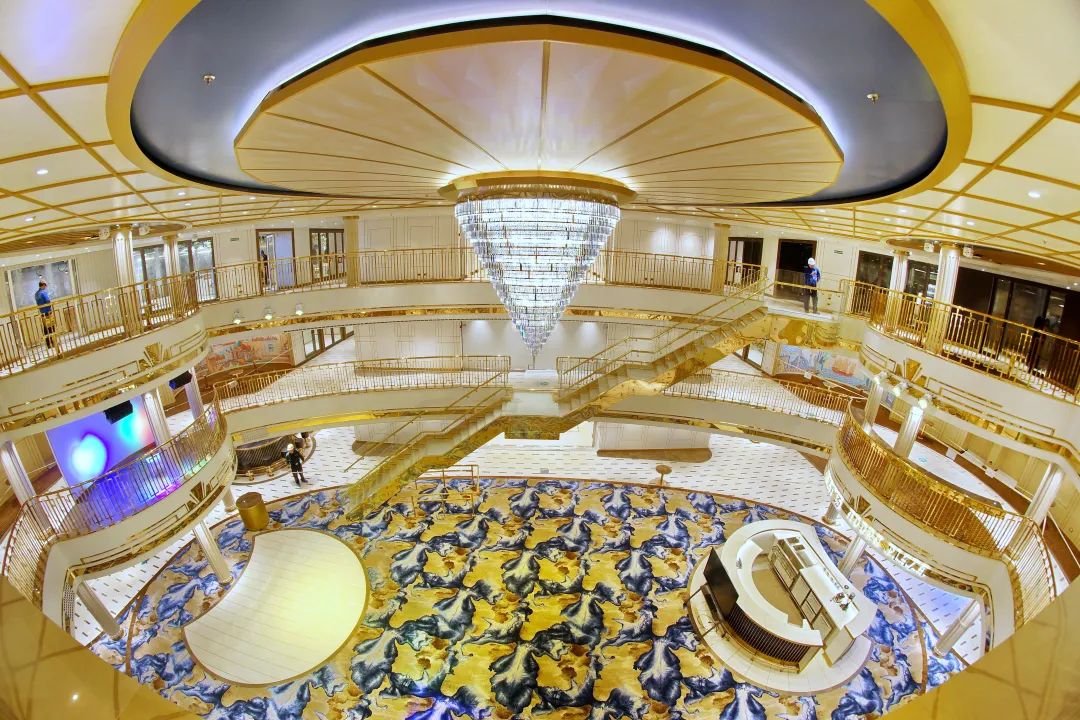 國產(chǎn)首艘大型郵輪總噸位13.55萬噸,長323.6米,寬37.2米,設(shè)計吃水8.26米,最大高度72.2米。全船搭載107個系統(tǒng)、5萬5千個設(shè)備,包含2500萬個零部件,完工敷設(shè)4750公里電纜、365公里管系、120公里風管。船上有客房2125間,可容納乘客5246人,配置了高達16層、面積4萬平方米的生活娛樂公共區(qū)域,被譽為“海上現(xiàn)代化城市”。
