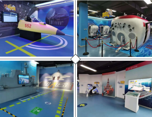 整個展館內(nèi)分布著護航體驗區(qū)、VR綜合體驗區(qū)、航母艦室漫游體驗區(qū)、近海VR鉆井平臺體驗區(qū)、艦載機起飛體感指揮體驗區(qū)、航母艦載機空體驗區(qū)等,可以讓參觀者模擬駕駛我國船海重器,親身感受搏浪滄海、護衛(wèi)海疆的震撼與自豪,使得船舶館成為海洋特色鮮明、模型館藏豐富、互動體驗感強的軍事科普教育展館和軍事文化娛樂園區(qū)。