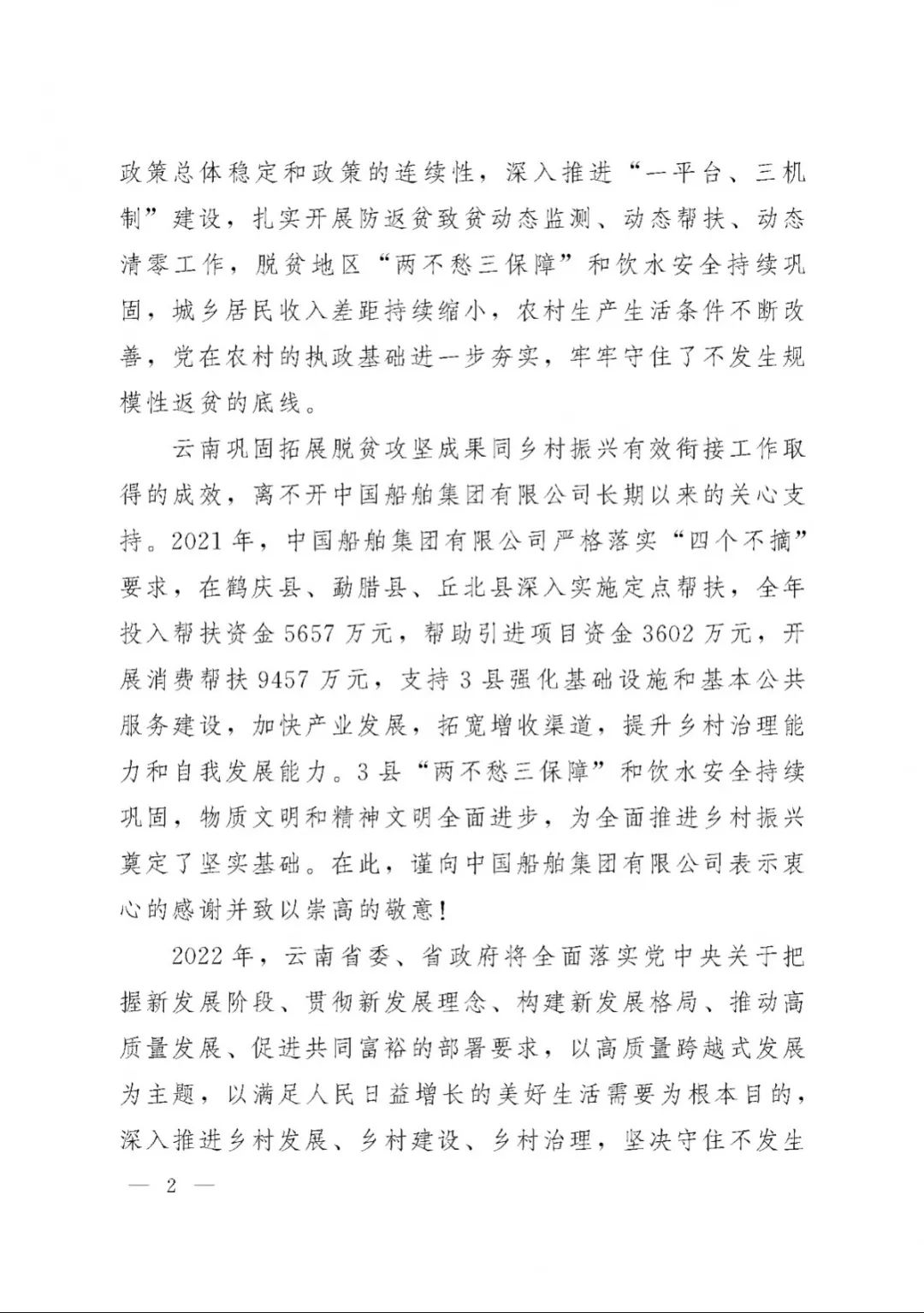 春節前夕,中國船舶集團陸續收到云南省委省政府、文山州委州政府、鶴慶縣委縣政府、勐臘縣政府發來的感謝信,對集團公司長期以來給予鶴慶縣、勐臘縣、丘北縣的傾力幫扶表示衷心感謝和崇高敬意。
