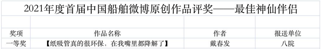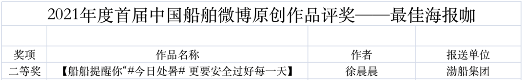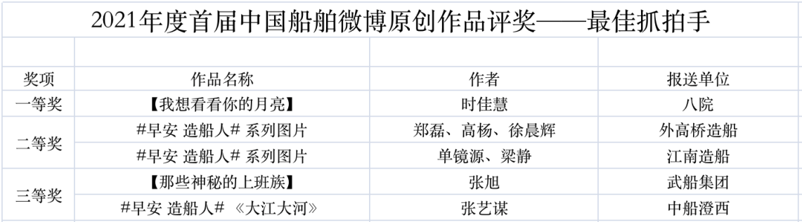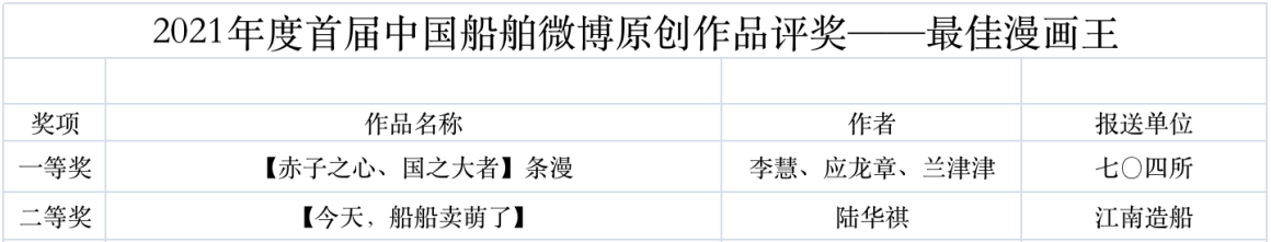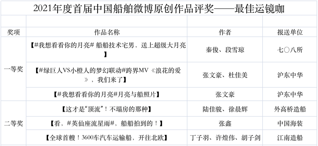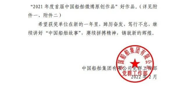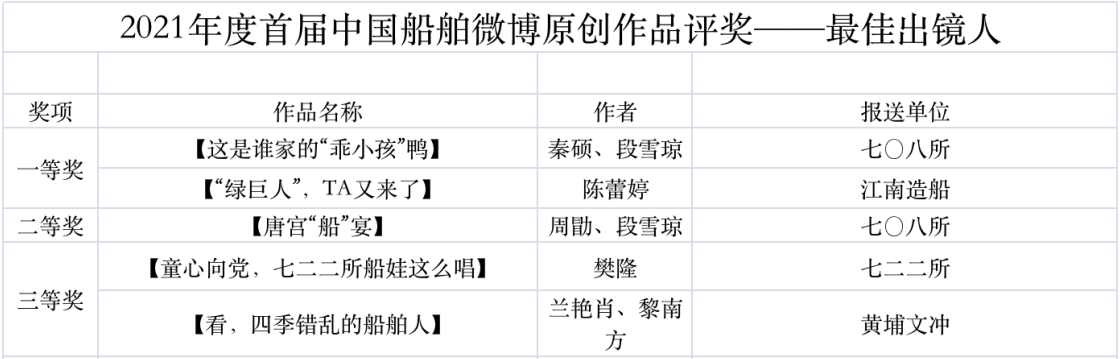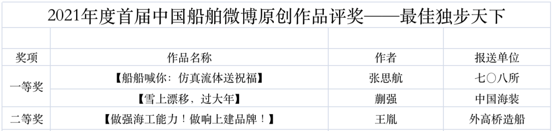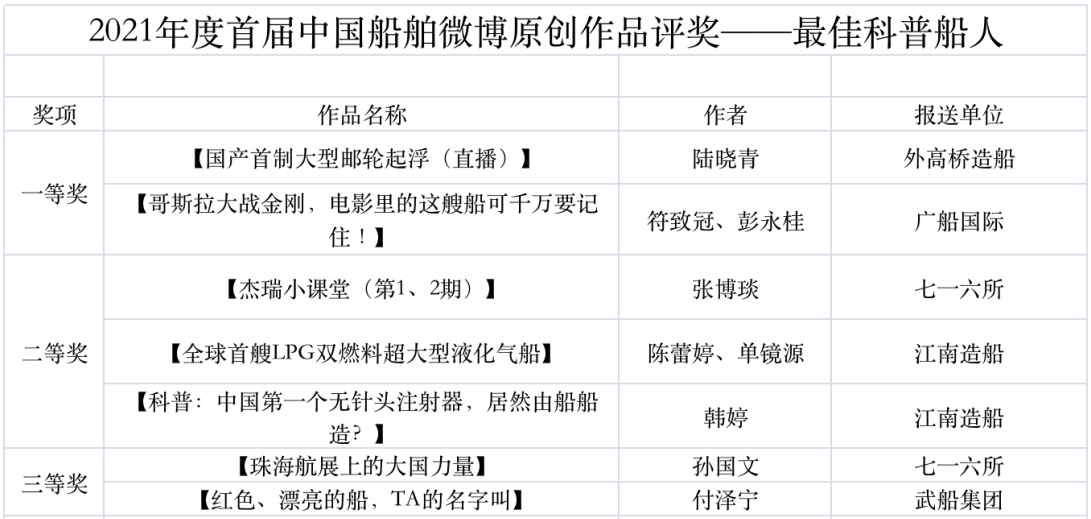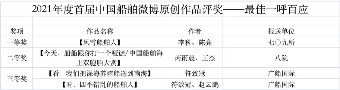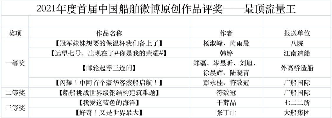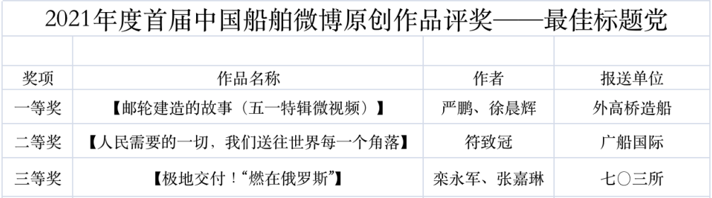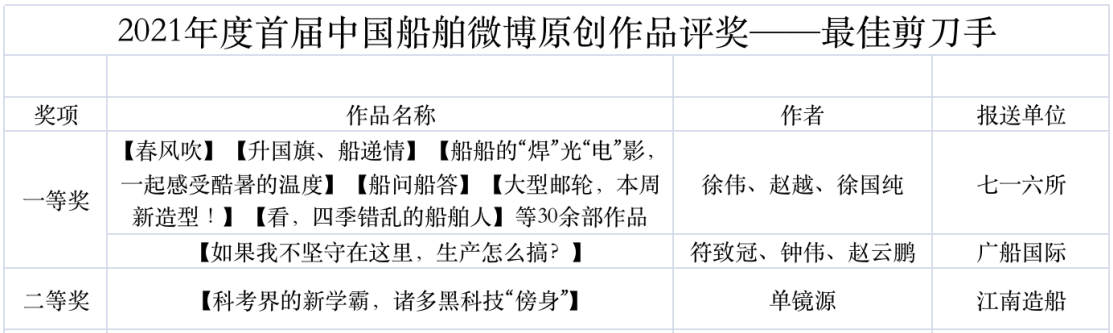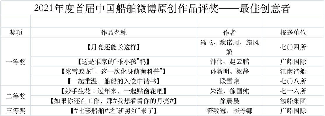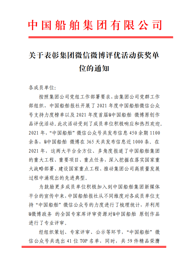 為鼓勵更多成員單位積極加入到中國船舶集團新媒體平臺的宣傳中來,在集團公司黨群工作部的指導下,中國船舶報社從不同維度,對2021年度各單位支持“中國船舶”微信的力度進行了梳理統(tǒng)計,并利用微博政務的全國專家?guī)煸u審資源,對2021年度“中國船舶”微博原創(chuàng)作品進行了專業(yè)評審,評選結果公布如下: