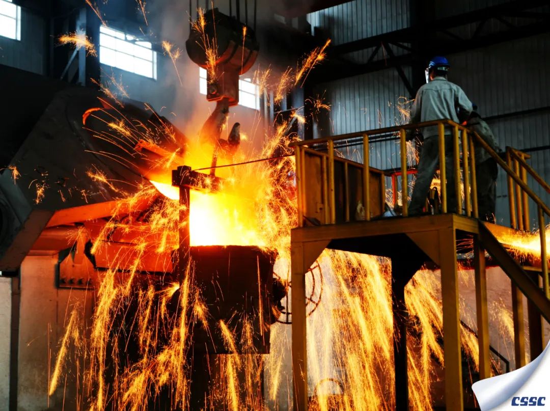 這是在中國船柴宜柴公司鑄造車間拍攝的一幅爐前工正在出鐵水的照片,1300多攝氏度的鐵水出爐時,整幅畫面十分紅火、大氣。展現(xiàn)了爐前工在60多攝氏度的爐前高溫下作業(yè)的工作場面。
