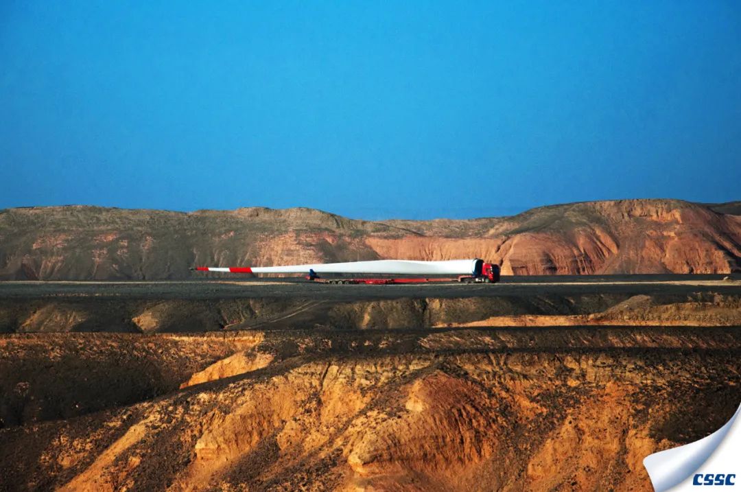 虎年開年, 中國海裝首臺H155-5MW機組在百里風區(qū)——新疆哈密成功完成吊裝,該機組是新疆哈密目前單機容量最大的風電機組。圖為超大型風葉運輸過程的縮影。