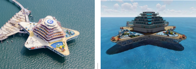 以濱海城市為依托,該方案重點建設(shè)需求旺盛、基礎(chǔ)好、見效快的“海洋文旅+深海養(yǎng)殖+海上風(fēng)電+海洋信息管網(wǎng)”4個要素單元,釋放旅游、養(yǎng)殖、綠色能源耦合效應(yīng)。綜合體采用模塊化設(shè)計、區(qū)域化協(xié)同部署,由濱海向深遠(yuǎn)海帶狀輻射,布局建設(shè)游輪游艇群、養(yǎng)殖文旅平臺、深海養(yǎng)殖產(chǎn)業(yè)園、分布式海上風(fēng)電場及智能微電網(wǎng)、深海移動養(yǎng)殖工廠和海洋信息管網(wǎng)等風(fēng)漁文旅結(jié)合項目。以郵輪游艇連接海上設(shè)施,構(gòu)建海上旅游娛樂交通網(wǎng),以中小型郵輪航線實現(xiàn)沿海城市綜合體間串聯(lián),構(gòu)建沿海城市海上旅游觀光帶,同時培育郵輪與康養(yǎng)休閑岸海互動融合模式,捕捉、帶動、滿足多元化潛在消費需求,打造風(fēng)漁文旅等一二三產(chǎn)業(yè)融合新業(yè)態(tài),形成沿海藍(lán)色海洋經(jīng)濟帶。