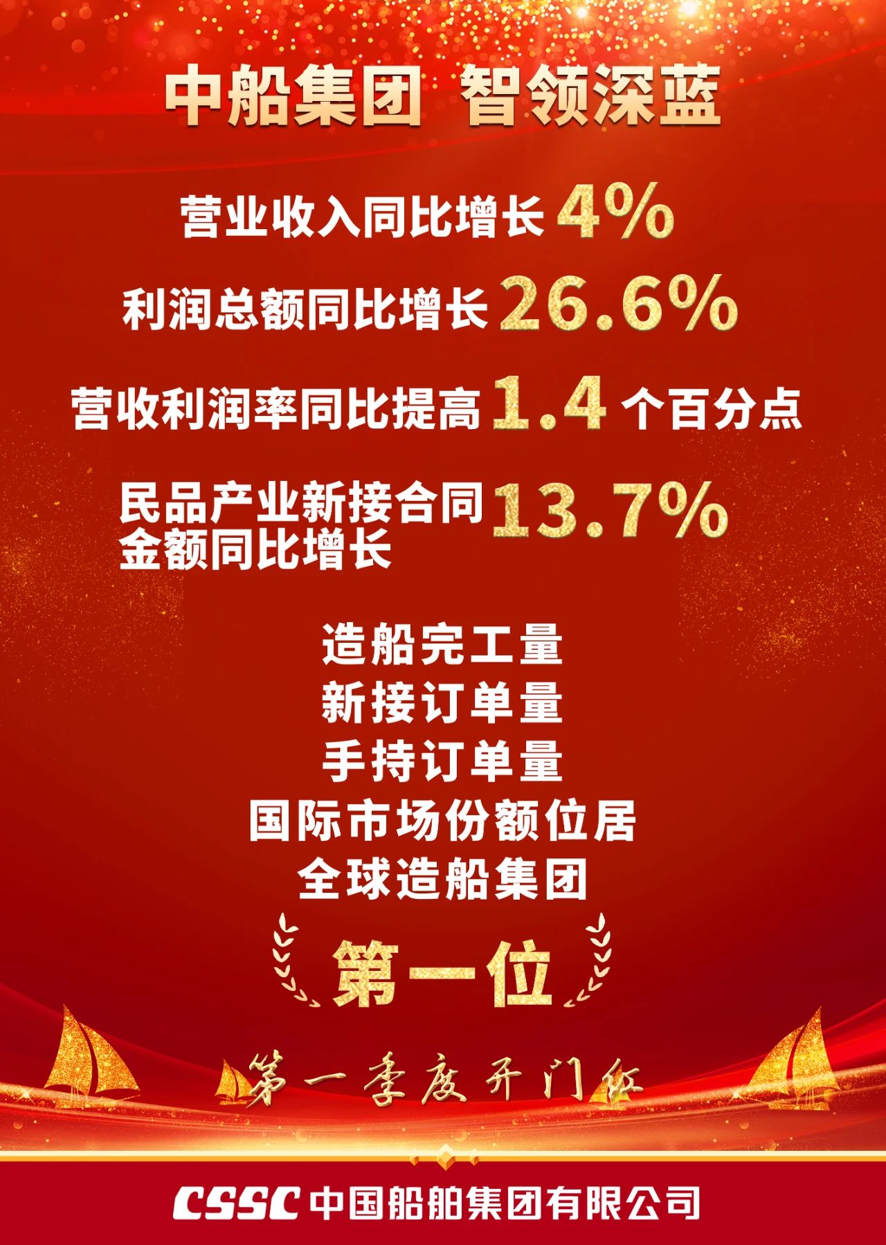 一季度,中船集團(tuán)營業(yè)收入同比增長4%,利潤總額同比增長26.6%,營收利潤率同比提高1.4個百分點(diǎn),民品產(chǎn)業(yè)新接合同金額同比增長13.7%,造船完工量、新接訂單量、手持訂單量國際市場份額位居全球造船集團(tuán)第一位,收獲首季開門紅。