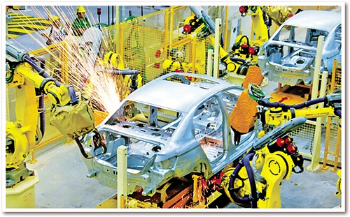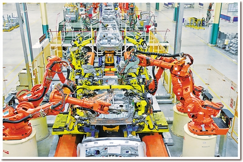 日前,記者在東風(fēng)汽車公司旗下神龍汽車公司成都工廠焊裝車間看到,占地面積約10個(gè)足球場(chǎng)的車間儼然就是一個(gè)“機(jī)器人王國(guó)”:442臺(tái)各種機(jī)器人都在忙碌著,所有點(diǎn)焊、弧焊、激光焊、螺柱焊、涂膠、包邊、鉚接、部件搬運(yùn)等“重活、累活”全部由機(jī)器人自動(dòng)完成。焊裝分廠廠長(zhǎng)孫繼勝介紹說,除442臺(tái)機(jī)器人外,車間還有另外一個(gè)“撒手锏”??六面體轉(zhuǎn)臺(tái)設(shè)備。“原來生產(chǎn)1個(gè)車型要建6條生產(chǎn)線,現(xiàn)在1條生產(chǎn)線就可以生產(chǎn)6種車型。”孫繼勝說。