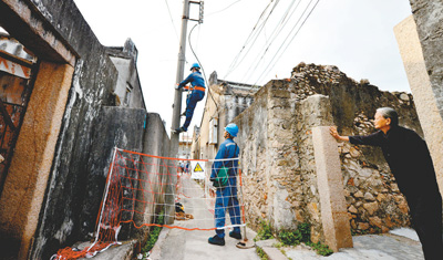 南方電網(wǎng)廣東汕頭金平供電局運(yùn)維人員對(duì)當(dāng)?shù)匾惶幣f線路進(jìn)行改造。(潘軍 攝)