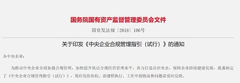 11月2日,國(guó)務(wù)院國(guó)資委印發(fā)了《中央企業(yè)合規(guī)管理指引(試行)》,推動(dòng)中央企業(yè)全面加強(qiáng)合規(guī)管理,加快提升依法合規(guī)經(jīng)營(yíng)管理水平,著力打造法治央企,保障企業(yè)持續(xù)健康發(fā)展。