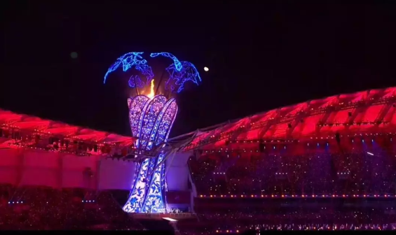 ▲第七屆世界軍運會開幕式點燃圣火后的火炬塔