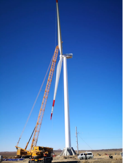 ????近日,中國海裝鑫垣新疆昌吉奇臺北塔山99兆瓦風(fēng)電項目首臺H136-2.2兆瓦機組完成吊裝。