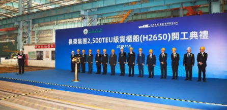 ????中國船舶集團所屬江南造船(集團)有限責任公司的2500TEU集裝箱船項目是長榮海運首次在中國內地訂造新船。該系列船入NK船級社,采用中國船舶集團所屬上海船舶研究設計院最新優化設計,加裝最新的Scrubber脫硫裝置。該船總長195.00米,垂線間長191.80米,型寬32.25米,型深17.00米,設計吃水10.00米,結構吃水11.20米,設計航速不低于20節(NCR),貨艙內集裝箱數922箱,甲板上集裝箱數1725 箱,甲板上冷箱數226箱。該船計劃于2021年交付。
