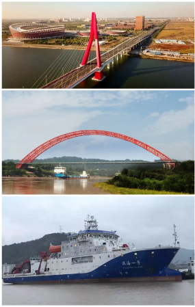 ????上圖所示均為武船集團承建的項目。圖1:遼寧盤錦遼濱沿海經濟開發區大橋;圖2:四川合江長江一橋;圖3:我國自主研制的第一艘載人潛水器支持母船“深海一號”。