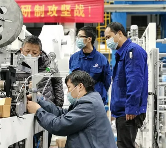 ????帶隊(duì)逆行的是鵬力塑造副總經(jīng)理王仕杰,一人承擔(dān)所有的外圍協(xié)調(diào)工作,不僅管好技術(shù)團(tuán)隊(duì)的吃住行和安全防疫工作,還找到了非常緊缺的試機(jī)無紡布原料和口罩耳繩焊接機(jī),極大地支撐了后續(xù)研制生產(chǎn)工作。