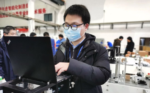 ????徐存培是平面口罩機(jī)項(xiàng)目的技術(shù)負(fù)責(zé)人。自接到平面口罩機(jī)研制任務(wù)以來,他幾乎就“長(zhǎng)”在公司里了。他穿梭在各臺(tái)平面口罩機(jī)間,一會(huì)兒墊腳測(cè)量放料架距離地面的高度,一會(huì)兒彎腰擰緊設(shè)備柜里的螺絲,一會(huì)兒又緊盯著傳送帶,看無紡布貼合的角度是否精準(zhǔn)無誤……