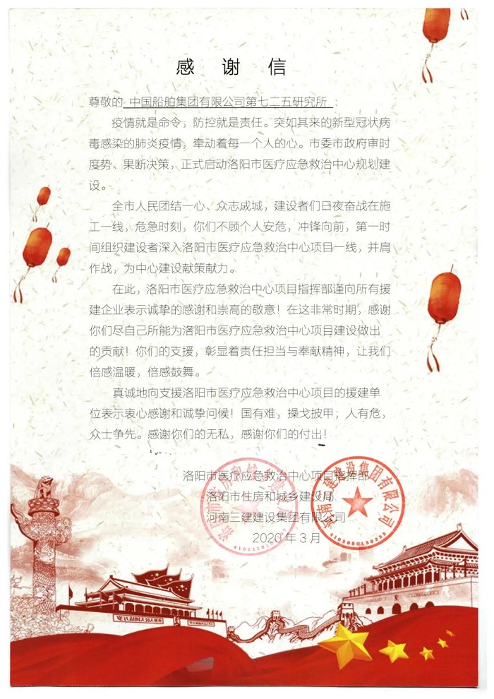 ????近日,中國船舶集團七二五所收到洛陽市醫療應急救治中心項目指揮部發來的感謝信,中國船舶集團旗下江蘇自動化研究所向英國合作單位寄送慰問函與防疫物資。洛陽市醫療應急救治中心項目指揮部,對七二五所在新冠肺炎疫情期間支援建設,洛陽市醫療應急救治中心項目建設作出的貢獻表示感謝。
