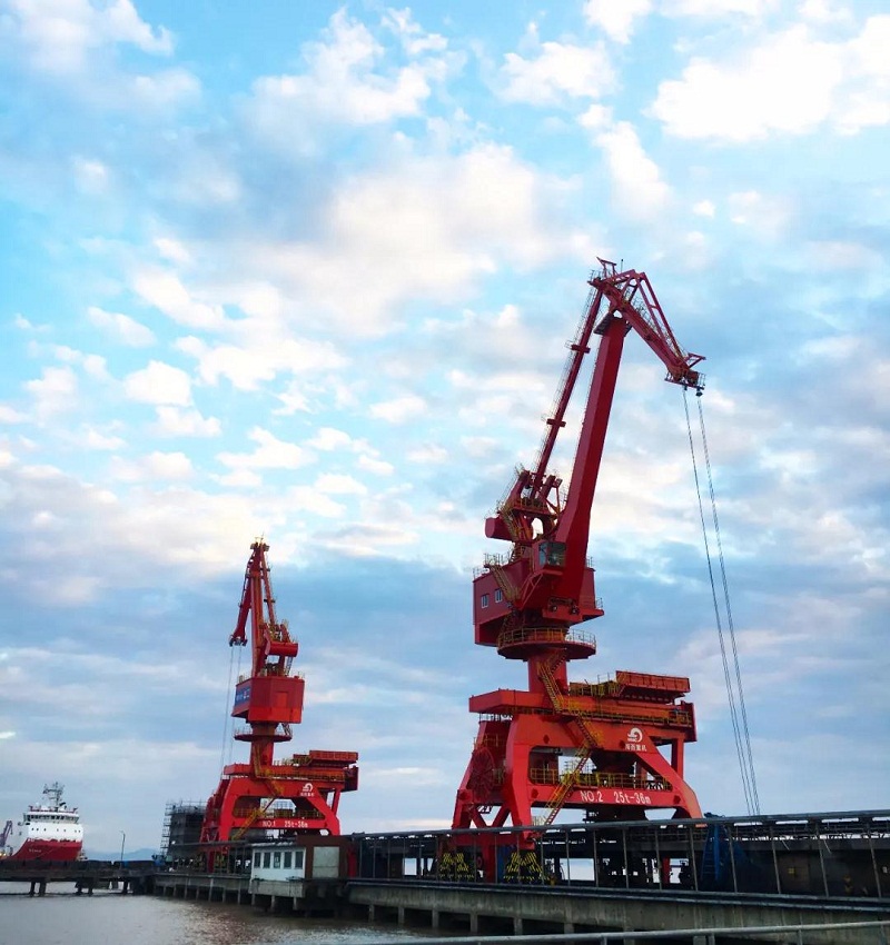 ????近日,武漢船機(jī)海西重機(jī)為寧波舟山港老塘山碼頭打造的2臺25T-36M四連桿帶斗門機(jī)順利交付。門機(jī)額定起重量25噸,工作幅度36米,額定工作效率800噸/時,主要用于煤炭和海沙的卸船作業(yè)。