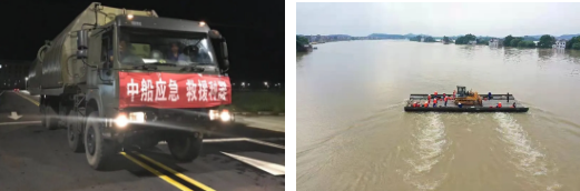 △ 中船應(yīng)急動力舟橋正在運(yùn)輸大型工程裝備進(jìn)行抗洪搶險(xiǎn)