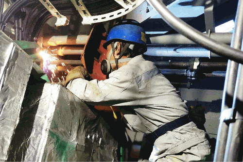 為保證臺風(fēng)來臨前能夠進(jìn)入錨地安全拋錨,大連公司海工公司員工戰(zhàn)高溫?fù)尮?jié)點,狹小的空間里進(jìn)行焊接作業(yè)。