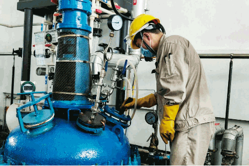 在原料藥車間,七一六所杰瑞藥業(yè)員工細(xì)心查看反應(yīng)釜內(nèi)物料反應(yīng)情況。此時釜內(nèi)溫度高達(dá)124.8℃,近身溫度超過50℃,全程反應(yīng)時間約3~4小時。