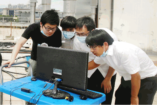 七一七所技術(shù)人員,在所內(nèi)試驗樓頂頭頂烈日開展工作。