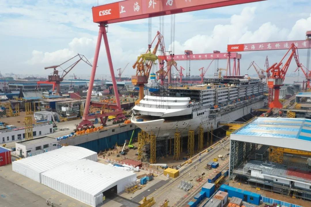 這標志著國產首制大型郵輪正式開啟艏部吊裝模式,9月份將實現全船結構貫通這一里程碑節點。