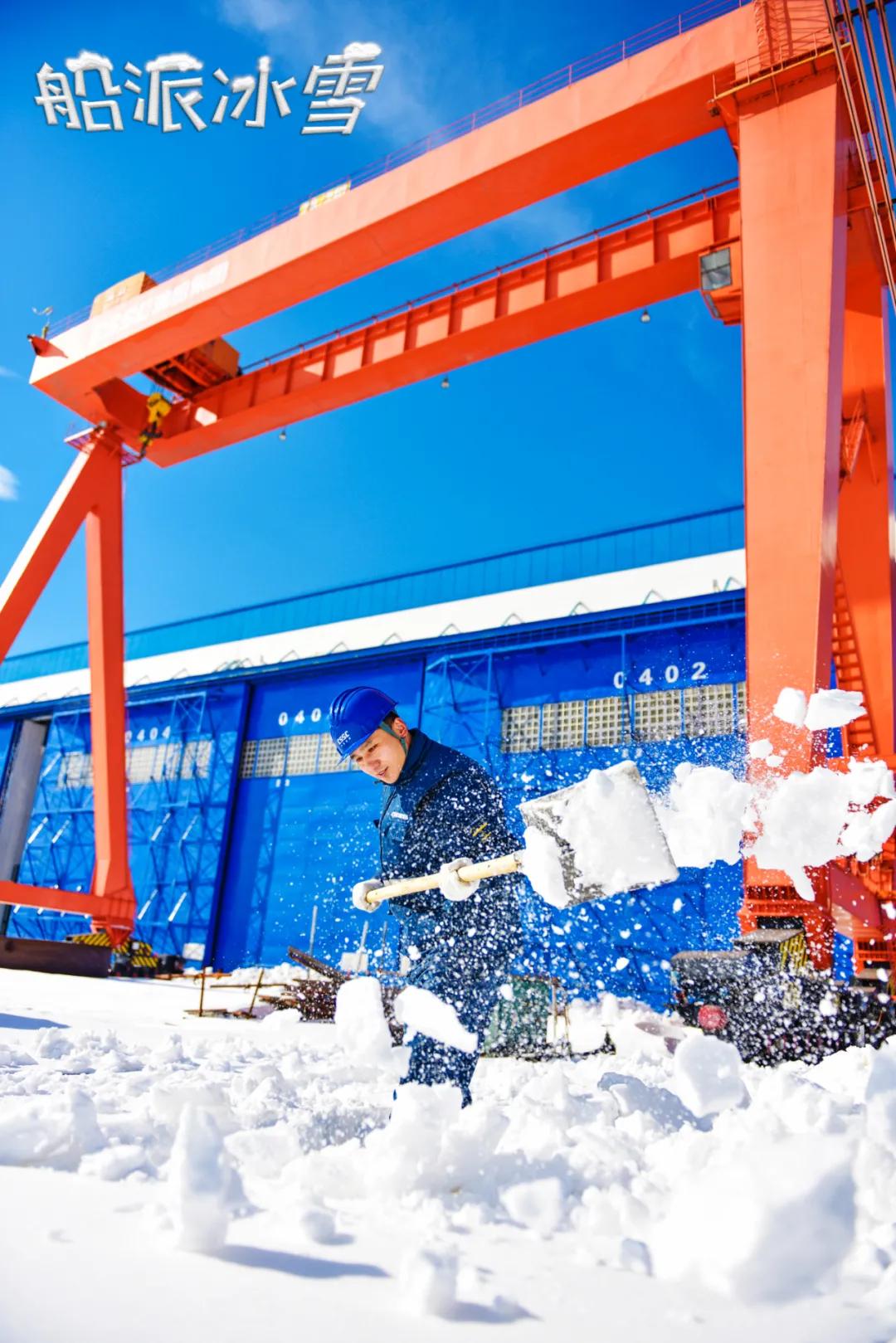 過膝的大雪掩埋了吊車的軌道,渤船小伙抄起“家伙”,為吊車開道,胳膊掄圓,雪花紛飛,別說這畫面還真有點浪漫了。