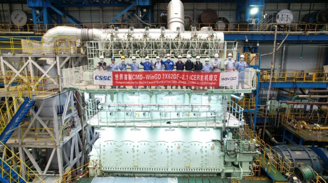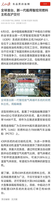 該型雙燃料主機(jī),配置了中國船舶集團(tuán)旗下WinGD公司研發(fā)的iCER系統(tǒng),最大持續(xù)功率15400千瓦,將作為主推進(jìn)裝置安裝在招商局金陵船廠為日本NYK船東建造的液化天然氣(LNG)雙燃料動(dòng)力7000車汽車運(yùn)輸船(PCTC)上。
