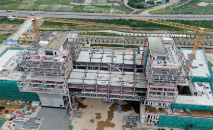 101#總部研發大樓是湛江灣實驗室一期項目的核心工程,其上部重達1.8萬噸的主體結構由53.4米跨度的轉換桁架承托。該轉換桁架是世界現有的第二大跨度轉換結構,同時與轉換桁架兩端相連的雙層鋼板剪力墻核心筒也是實現該建筑結構設計的關鍵部位。