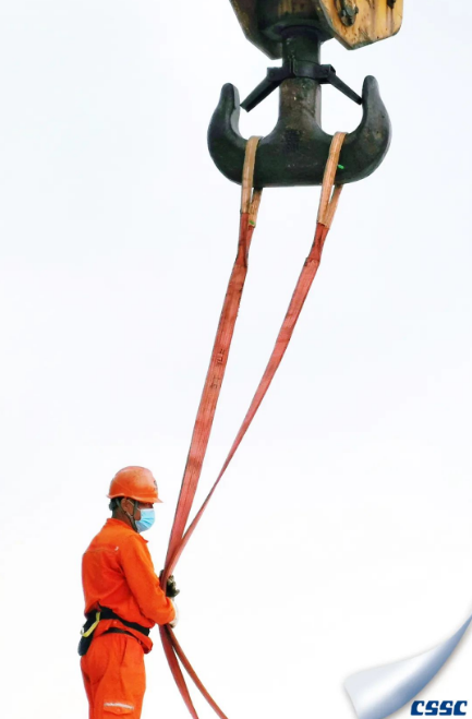 一名船舶起重工正在準(zhǔn)備起吊直徑10米、重約5噸的玻璃鋼材質(zhì)頂部圓盤(pán)至船舶上安裝,正值“梅花”過(guò)境后的陰雨天氣,身穿橙色工作服的船舶起重工在橙色吊帶、玻璃鋼材質(zhì)圓盤(pán)以及灰色天空下,構(gòu)筑了一幅簡(jiǎn)約而又濃墨重彩的線條與內(nèi)容相輔相成,彰顯了船舶工業(yè)之美、勞動(dòng)光榮之美。