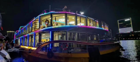 “廣游19”配置3015kWh純鋰電池驅動,Z形全回轉舵槳推進,經濟航速下可滿足7小時續航要求。船體上建采用大面積玻璃幕墻,具有開闊的觀光視野,可360度觀賞珠江日景夜景,可提供江景游覽、娛樂餐飲、會議招待、婚禮、音樂舞會、年會等綜合服務。