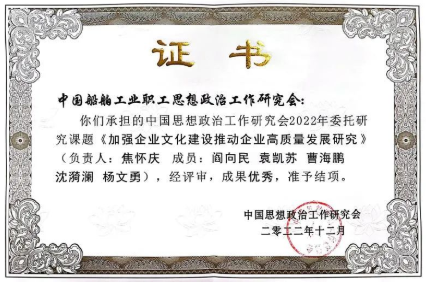 近日,由中國船舶工業(yè)職工思想政治工作研究會申報的中國思想政治工作研究會2022年委托課題《加強企業(yè)文化建設(shè),推動企業(yè)高質(zhì)量發(fā)展研究》評審結(jié)果公布,成果優(yōu)秀,報經(jīng)中央宣傳部領(lǐng)導(dǎo)審定準(zhǔn)予結(jié)項。這是中國船舶政研會首次承擔(dān)中國政研會委托課題并獲評優(yōu)秀。