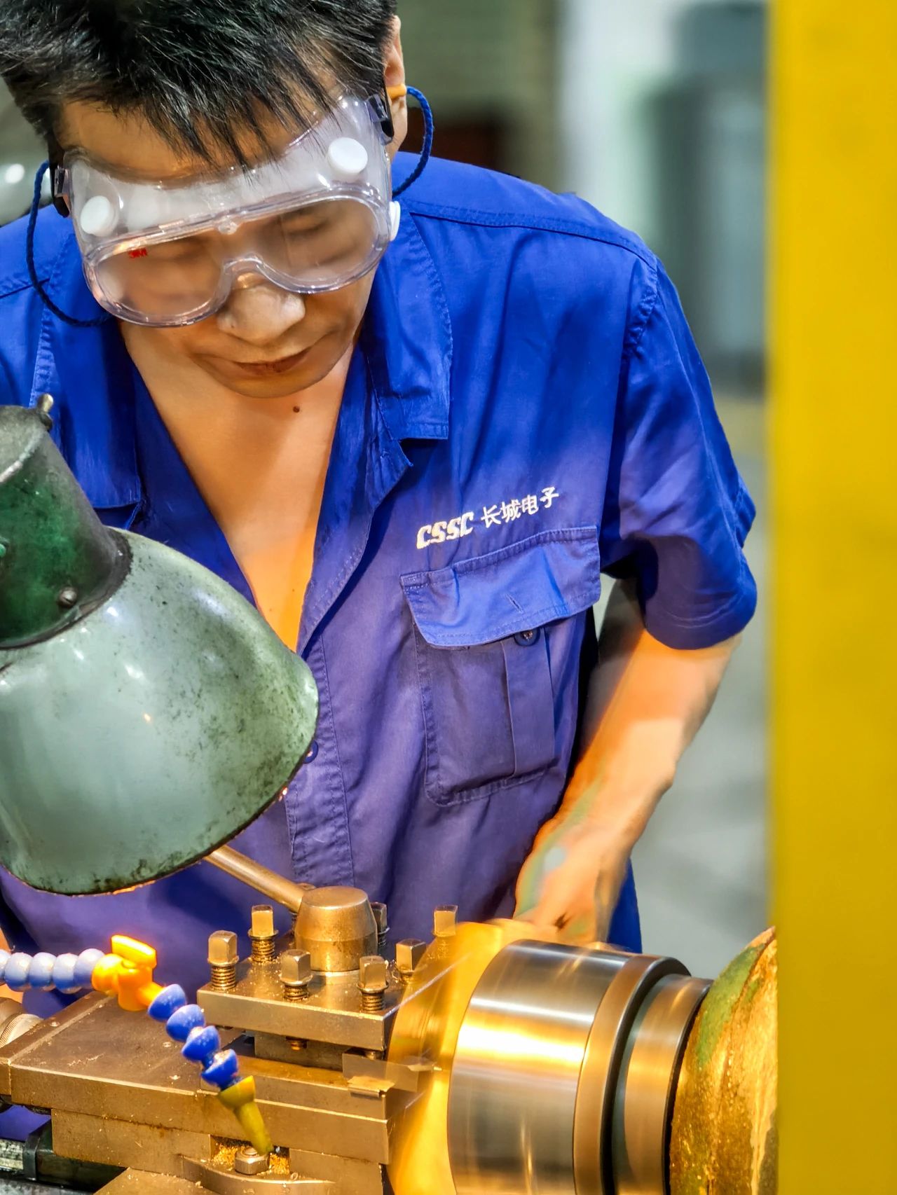中船發動機——調試人員頂著高溫在認真安裝傳感器,汗水濕透了衣裳。