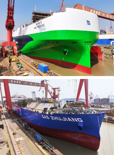 8月11日,中國(guó)船舶集團(tuán)旗下江南造船4號(hào)船塢迎來(lái)一艘99000立方米超大型乙烷乙烯運(yùn)輸船(VLEC)和一艘7800車位汽車運(yùn)輸船(PCTC)出塢 ,一艘99000立方米VLEC半船和一艘7800車位PCTC半船同步起浮,達(dá)成了“PV同步”建造模式的首批次出塢。