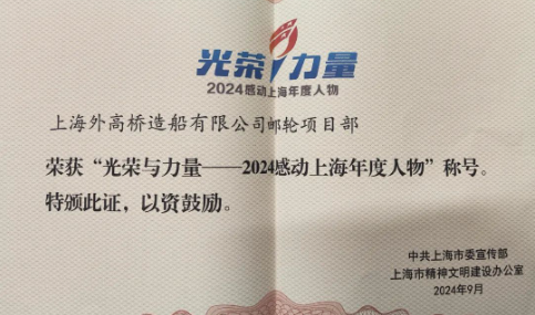“光榮與力量——2024感動上海年度人物推選活動”獲獎名單日前揭曉。中國船舶集團外高橋造船郵輪項目部獲評“2024感動上海年度人物”。本次活動以2023年8月至2024年7月中,上海市涌現的事跡突出、精神可嘉、社會認可的模范人物和先進集體為推選對象,通過175萬市民網絡投票和專家評審推選出先進典型。