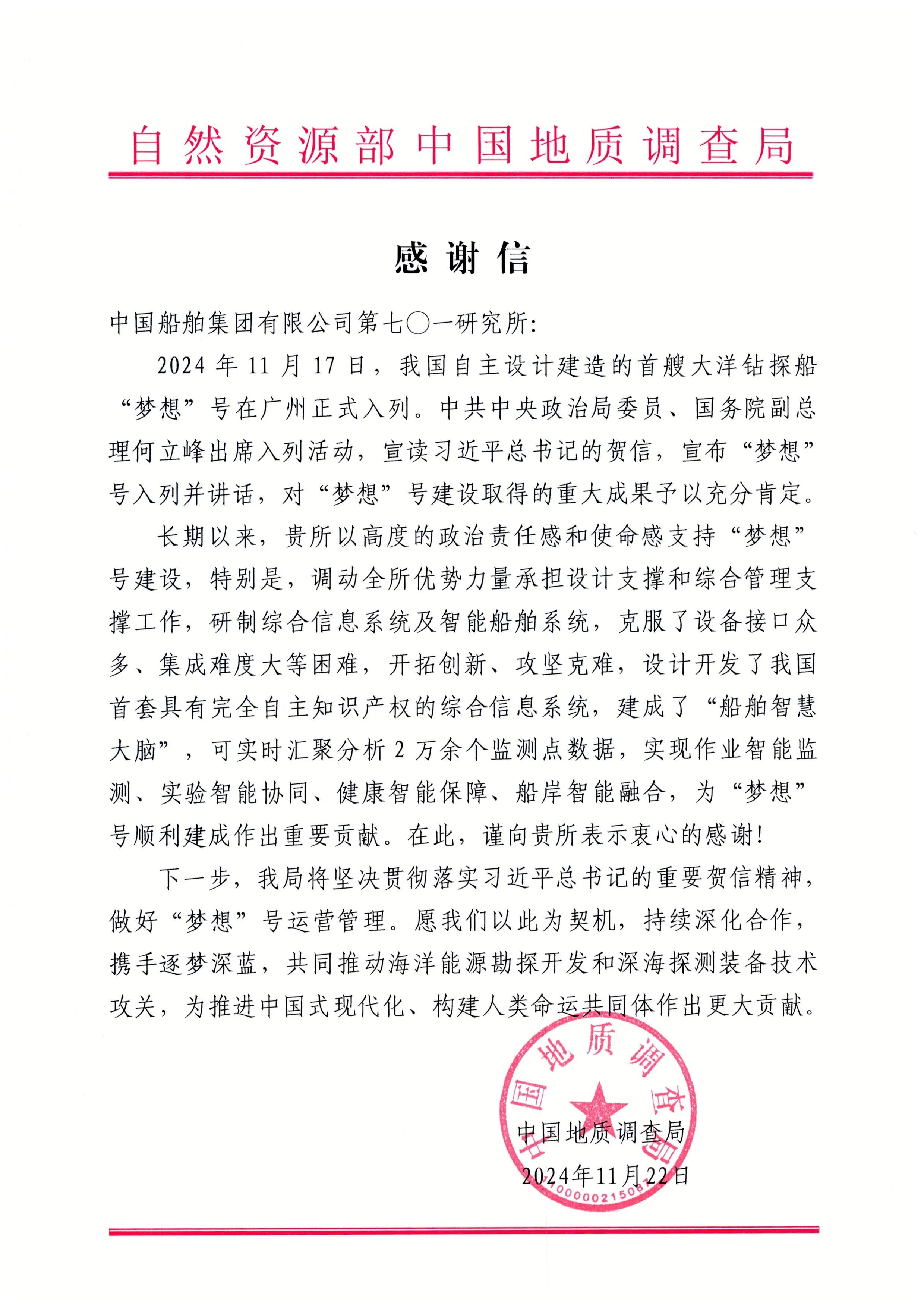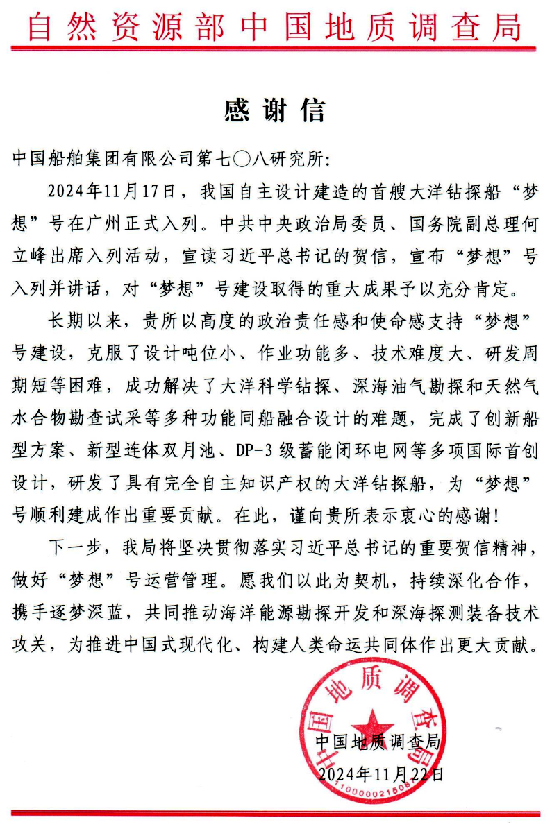 中國地質(zhì)調(diào)查局在信中對中國船舶集團(tuán)七〇八所在“夢想”號立項(xiàng)論證、研發(fā)設(shè)計(jì)、建造調(diào)試等階段所做的突出工作和卓越貢獻(xiàn)表示感謝。