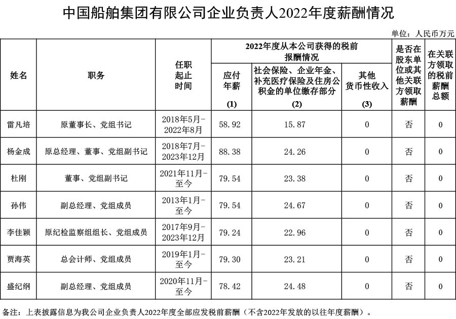 中國船舶集團有限公司企業負責人2022年度薪酬情況