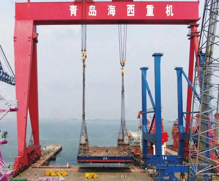 ????在該項目的前期建造策劃階段,海西重機沒有采用常規(guī)船塢下水或滑移下水方式,而是大膽提出利用1600噸龍門吊整體吊裝下水的設(shè)想。經(jīng)過一系列重量預(yù)估及方案論證,最終核定吊裝下水重量接近1440噸。