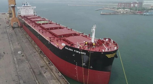 6月11日,由中國船舶集團旗下大船集團山船重工建造,中船貿易作為聯合賣方,為挪威Frontline公司打造的8.2萬噸散貨船“GOLDEN FORWARD”號交付離廠。
