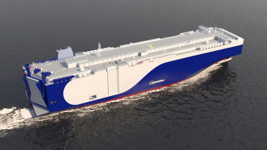 該船型由中國(guó)船舶集團(tuán)旗下上海船院設(shè)計(jì),總長(zhǎng)200米,型寬38米,裝載能力9000車(chē),可運(yùn)輸電動(dòng)車(chē)和常規(guī)燃料汽車(chē)以及其他類(lèi)型的重型滾裝貨物。