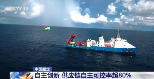 這是去年“奮斗者”號載人潛水器在馬里亞納海溝10909米處成功坐底的畫面,由中國船舶集團研制的“奮斗者”號載人潛水器是我國首臺具備全球海域載人進入能力的重要裝備。據(jù)測算,“奮斗者”號的國產(chǎn)化率超過了96.5%。同樣在民用船舶方面,整船的國產(chǎn)化率也有明顯提升。這是由中國船舶廣船國際完成的阿爾及利亞客滾船,具有完全的自主知識產(chǎn)權。