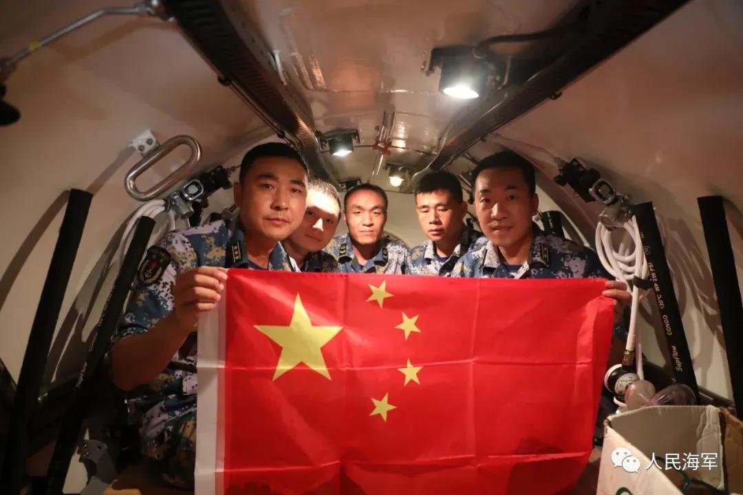 經過2個小時的緊張下潛,深潛救生艇終于到達,并突破指定極限下潛深度,官兵們展開五星紅旗驕傲地宣布“我的戰位在海底531.1米。