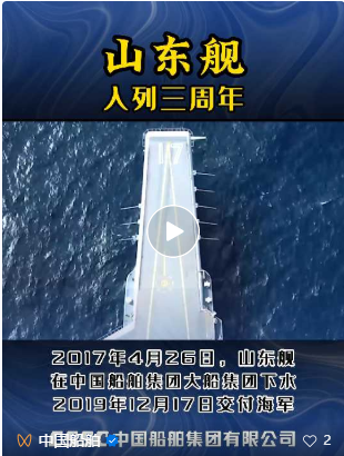 山東艦是我國第二艘航空母艦,也是我國自主設(shè)計(jì)、自主配套、自主建造的首艘航母。2017年4月26日,山東艦在素有“海軍艦艇搖籃”美譽(yù)的中國船舶集團(tuán)旗下大船集團(tuán)碼頭下水,自此揭開了中國雙航母時(shí)代篇章。