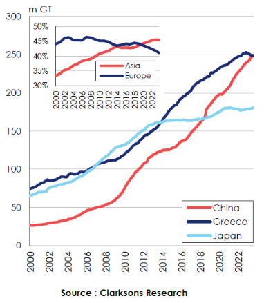 截至8月12日,我國船東所持有的船隊規(guī)模已經(jīng)達到2.492億總噸,市場份額占比為15.9%(中國船東的船隊價值約為1800億美元),略高于希臘船東的2.490億總噸,市場份額占比15.8%(希臘船東的船隊價值約為1630億美元)。