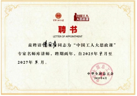 近日,中華全國總工會正式聘請中船集團重慶紅江傅國濤為“中國工人大思政課”專家名師庫講師,聘期兩年。這一聘任旨在推動“大思政課”建設走深走實,發揮優秀人才在思想政治教育中的示范引領作用。
